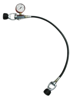 These air transfer devices, also called cross-overs, are used to equalize pressure between 2 dive cylinders. Each unit has a 2-foot service hose and a bleeder vent on one end. Also includes a 5,000 psi gauge that allows tank pressure monitoring. Both DIN and standard/yoke models are available.
