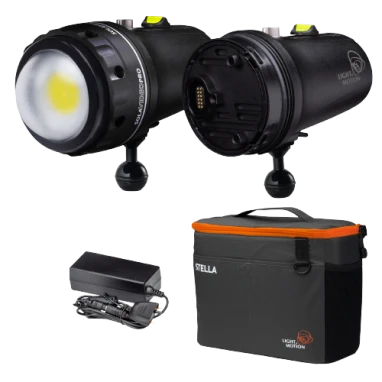 The professional’s choice, Sola Video Pro 15000 combines Light & Motion’s 30 year pedigree as the leader in underwater imaging design with the future of lighting technology. Powerful 15000 lumen certified output and regulated design provides lighting consistency content creators demand. Featuring an exclusive dome port, this optic provides an impressive 115° flood beam designed for wide-angle work and ensuring full lighting coverage even with a fisheye lens. The Double Dive 1x Kit includes the Sola Video Pro 15000 and and an innovative body module with an included soft case. This allows the shooter to quickly change out the battery body of the light to integrate a fully charged system – yet unlike replaceable batteries this system is reliable (eliminates flooding risks from opening the battery compartment), has enhanced safety with a sealed system, and can be swapped on the Sola lighthead in seconds. The perfect solution for divers that are shooting multiple dives in remote locations and may not be able to recharge the light during a surface interval.