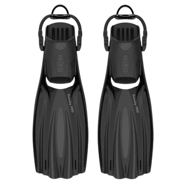 High performance professional fins with stiff molded side rails and a soft flexible center blade. The soft channels running the length of the fin blade keeps it nice and flexible while the stiff side rails allow for good power and acceleration. The Hog Velocity Pro fin blade is engineered with strong side rails to improve stability and channel the thrust, the middle of the blade is thermoplastic and composite material to create an efficient channeling of thrust down the blade with a performance/effort ratio among the best on the market. Fins secure a tight fit with raised rib on the foot plate and bungee strap with big easy-to-grasp finger loop.